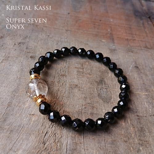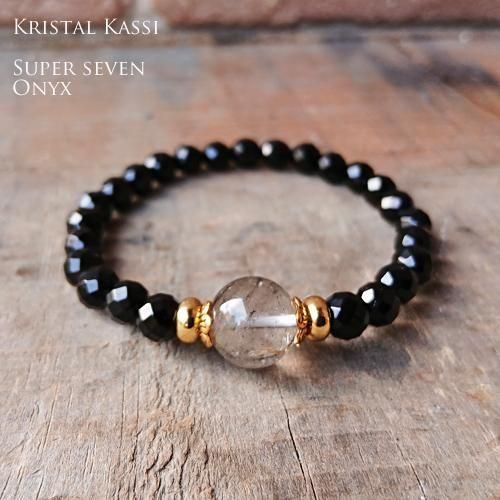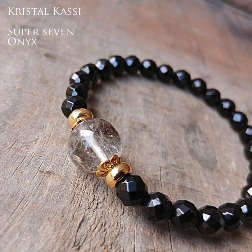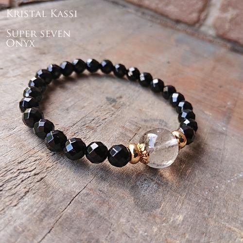 水晶とスモーキークォーツが混じり合う美しいスーパーセブンとオニキスのブレスレット