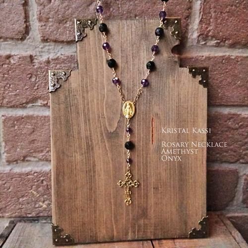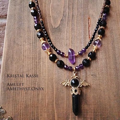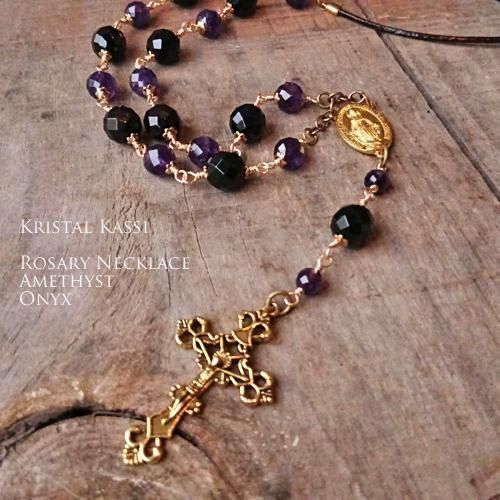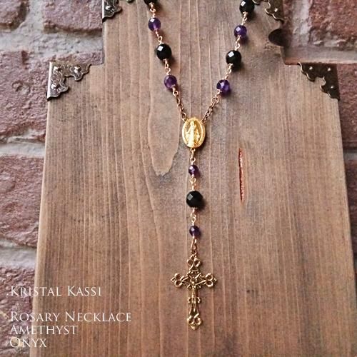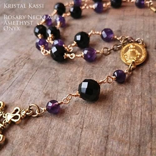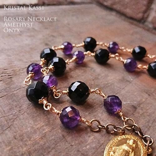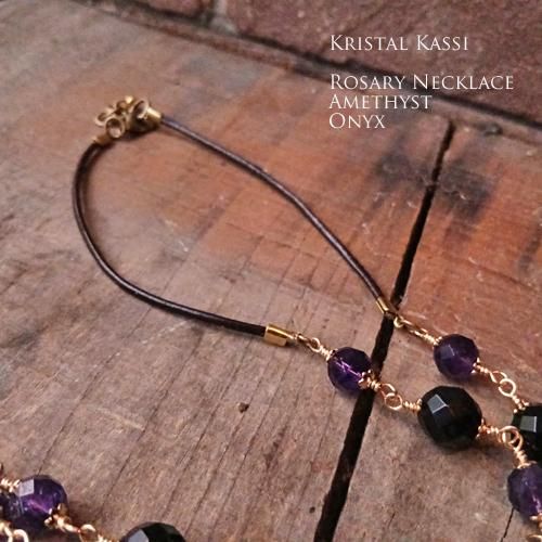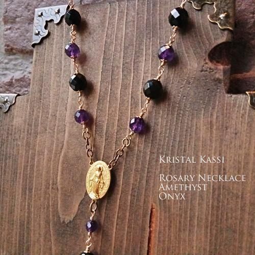 キラキラと光を放つカットオニキスとカットアメジストのロザリオ風ネックレス。